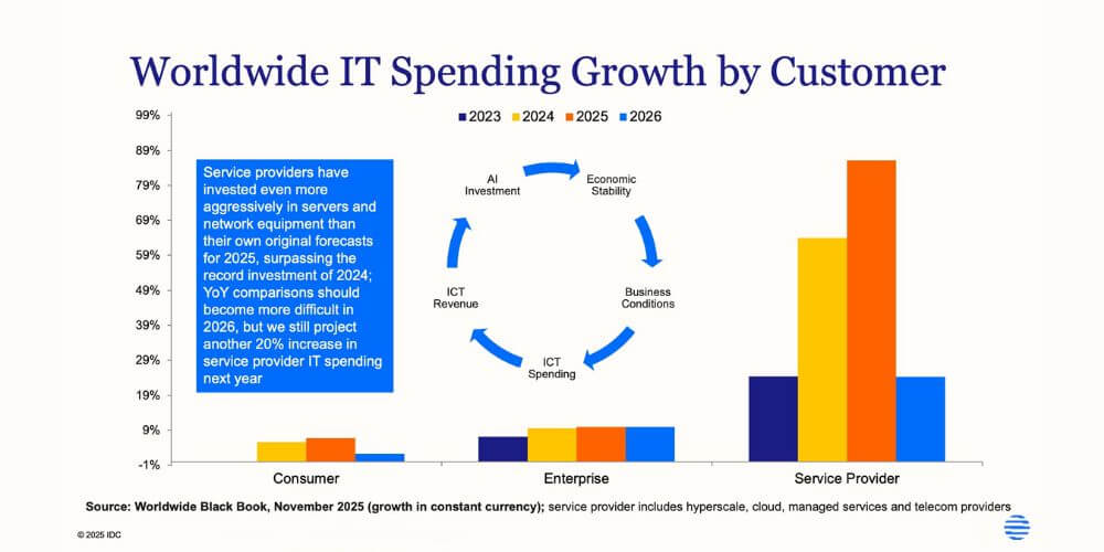 Service-Provider haben deutlich mehr in Server- und Netzwerk-Equipment investiert, als sie ursprünglich für 2025 prognostiziert hatten. (Quelle: IDC)