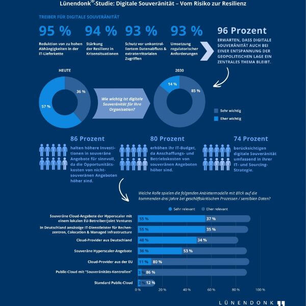 Lünendonk & Hossenfelder ordnet digitale Souveränität in seiner aktuellen Studie, »Digitale Souveränität – Vom Risiko zur Resilienz«, als zunehmend geschäftskritisches Thema ein. Treiber sind vor allem starke Abhängigkeiten von internationalen Cloud- und IT-Anbietern sowie geopolitische Unsicherheiten, die den Zugriff auf Daten und Services beeinflussen können.