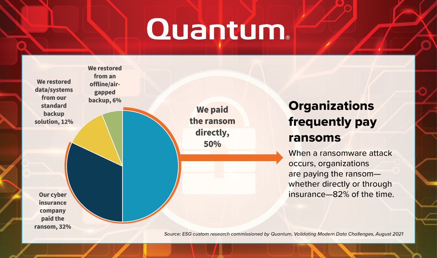Ransomware bleibt die größte Bedrohung für Unternehmensdaten.(Quelle: Quantum)Eine Studie von Quantum und ESG Research (Enterprise Strategy Group) unter mehreren hundert Unternehmen und IT-Verantwortlichen kommt zu dem Ergebnis, dass Cyber-Bedrohungen, unkontrolliertes Datenwachstum und hohe Speicherkosten die größten Herausforderungen beim Datenmanagement sind. Das ist so weit nachvollziehbar. Eher überraschend ist, dass 82 Prozent angeben, »Lösegeld« in Folge von Ransomware-Attacken bezahlt zu haben.