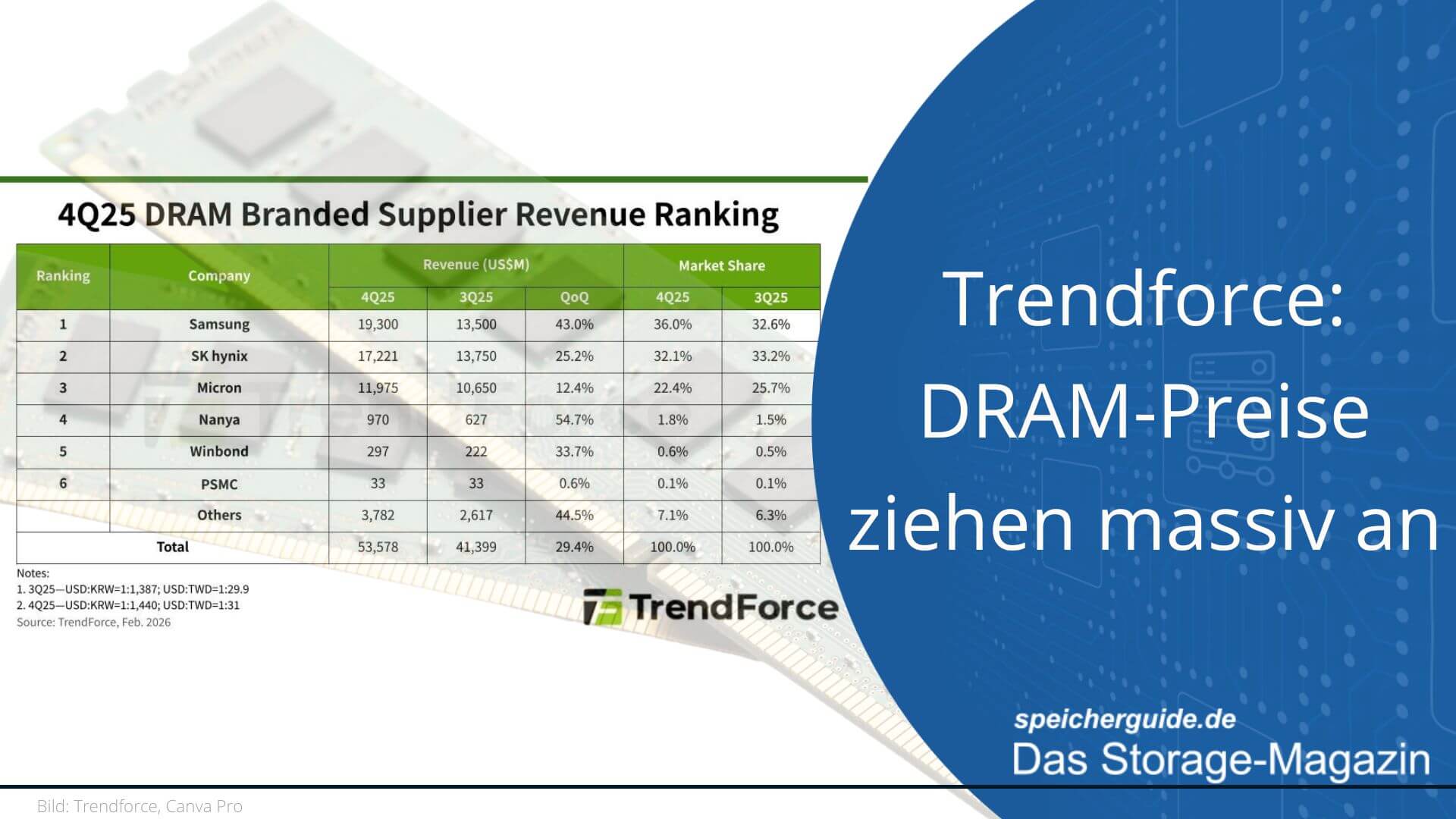 Trendforce meldet für 4Q25 einen DRAM-Umsatzsprung um 29,4 Prozent. Samsung übernimmt wieder die Spitzenposition vor SK Hynix. (Quelle: Trendforce)